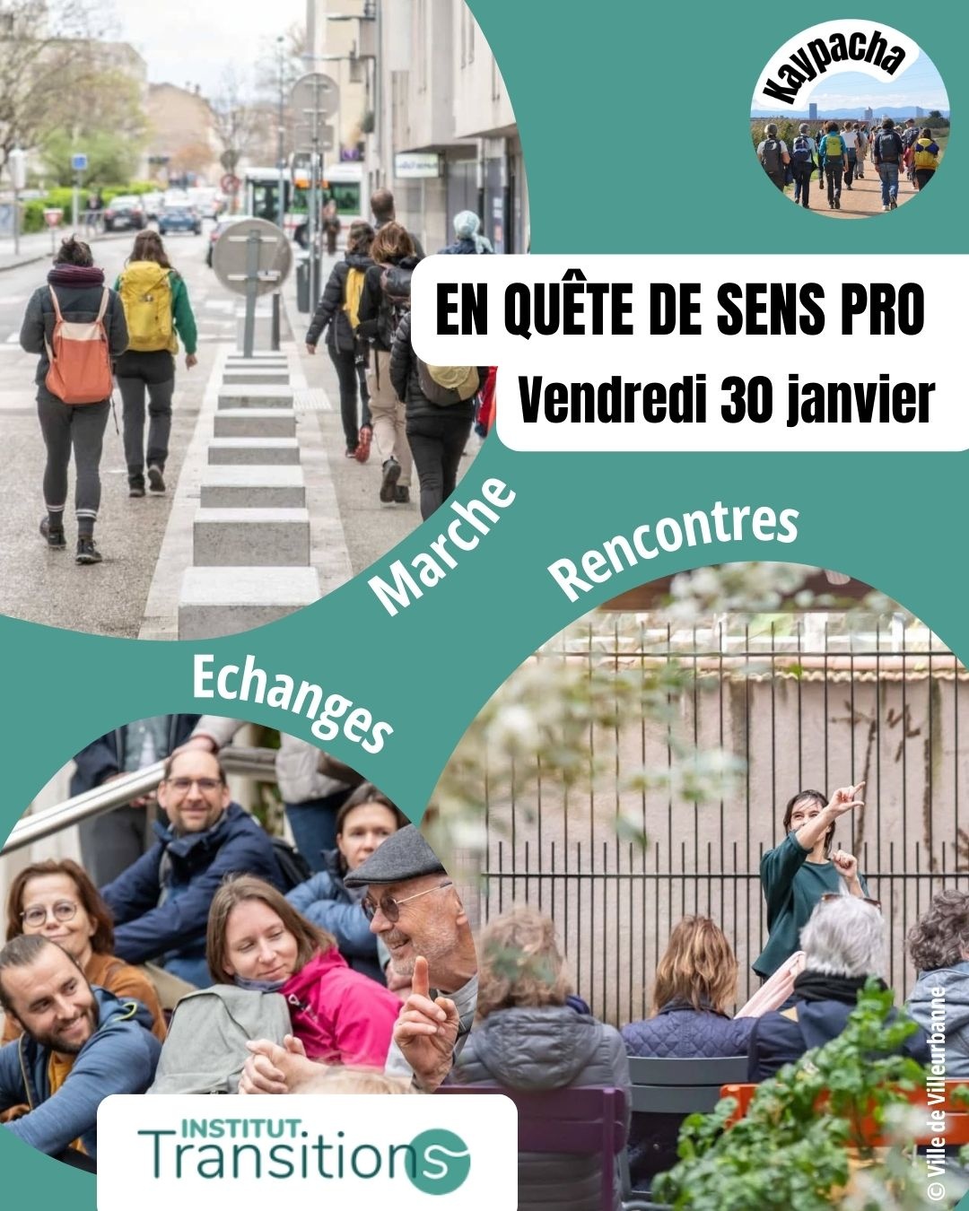 Vous souhaitez évoluer vers une vie professionnelle qui a du sens ? Ou vous êtes simplement curieux·ses de mieux connaître celles et ceux qui agissent pour la transition écologique et solidaire ? Le vendredi 30 janvier, Kaypacha et l’Institut Transitions vous donnent rendez-vous pour une journée de marche à travers Lyon, ponctuée de témoignages de personnes qui ont passé le pas.