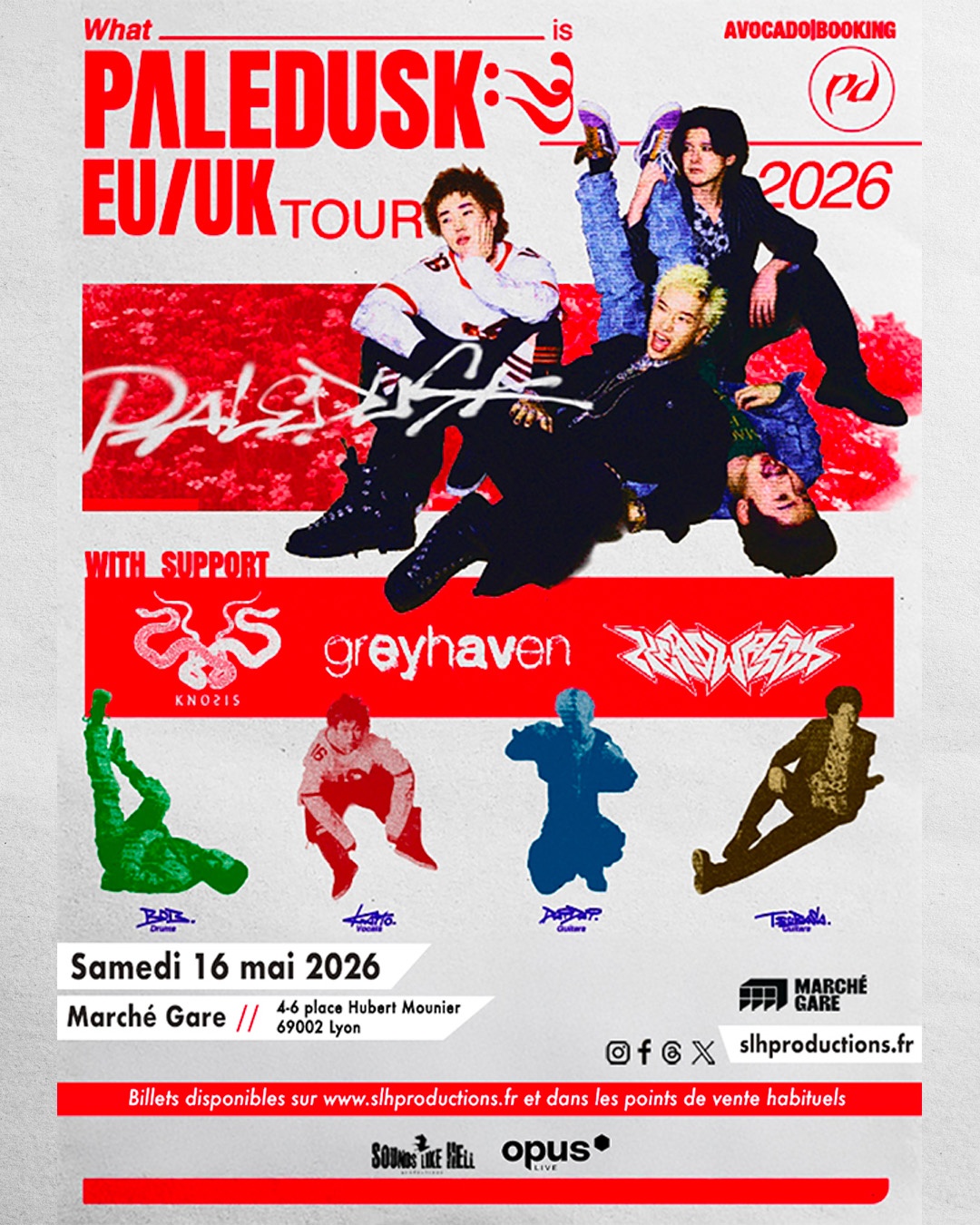 Quatre forces distinctes des paysages Metalcore, Post-Hardcore et Nu-Metal de tous horizons géographiques se réunissent pour une date unique à Lyon ! PALEDUSK, en tête d’affiche, mènera un plateau explosif composé de KNOSIS, GREYHAVEN et HEADWRECK.