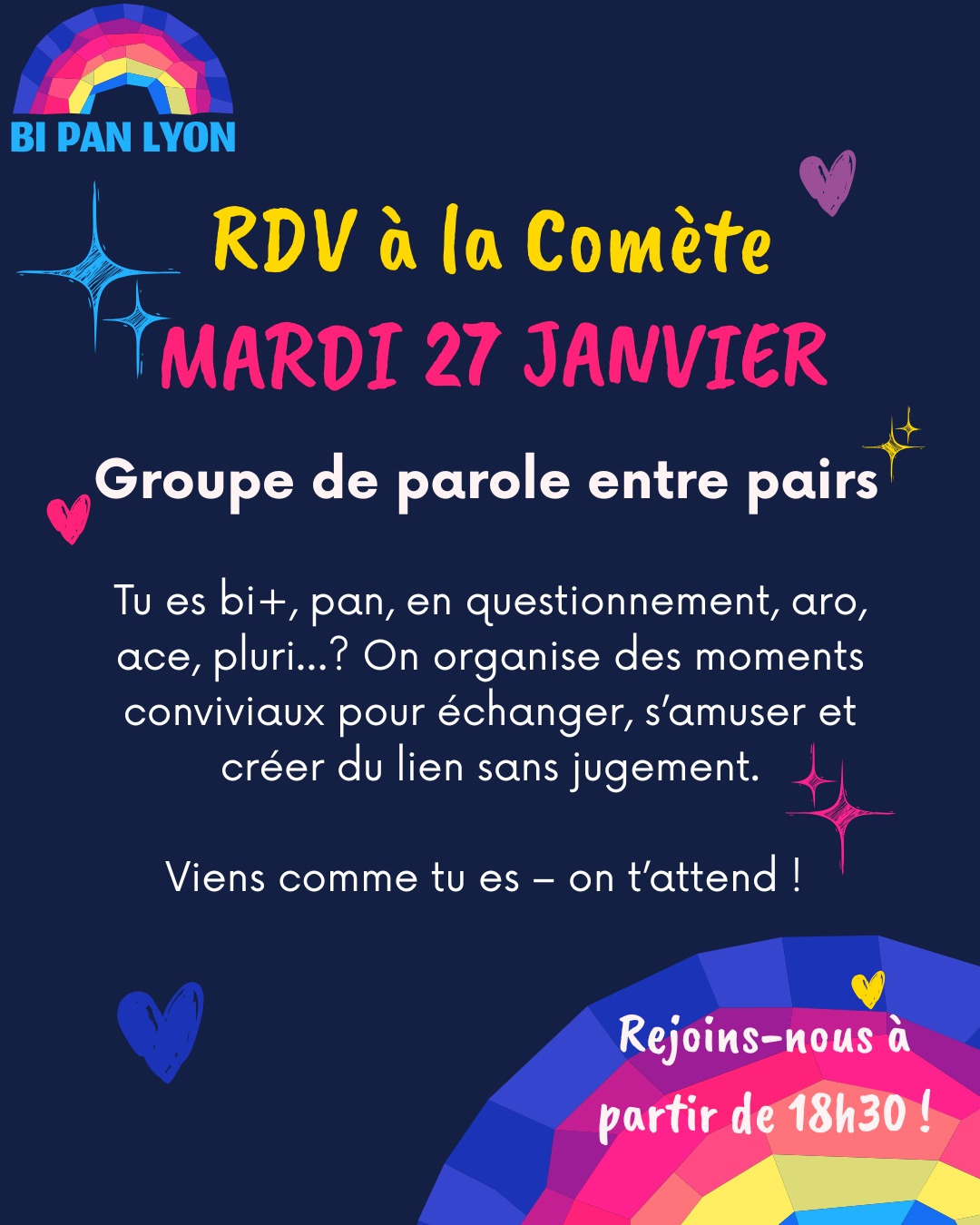 Nous sommes le collectif Bi Pan Lyon, un groupe informel qui organise des moments de convivialité pour les personnes bi, pan, en questionnement, et toute personne concernée par la fluidité des attirances (aro, ace, pluri, omni, etc.).