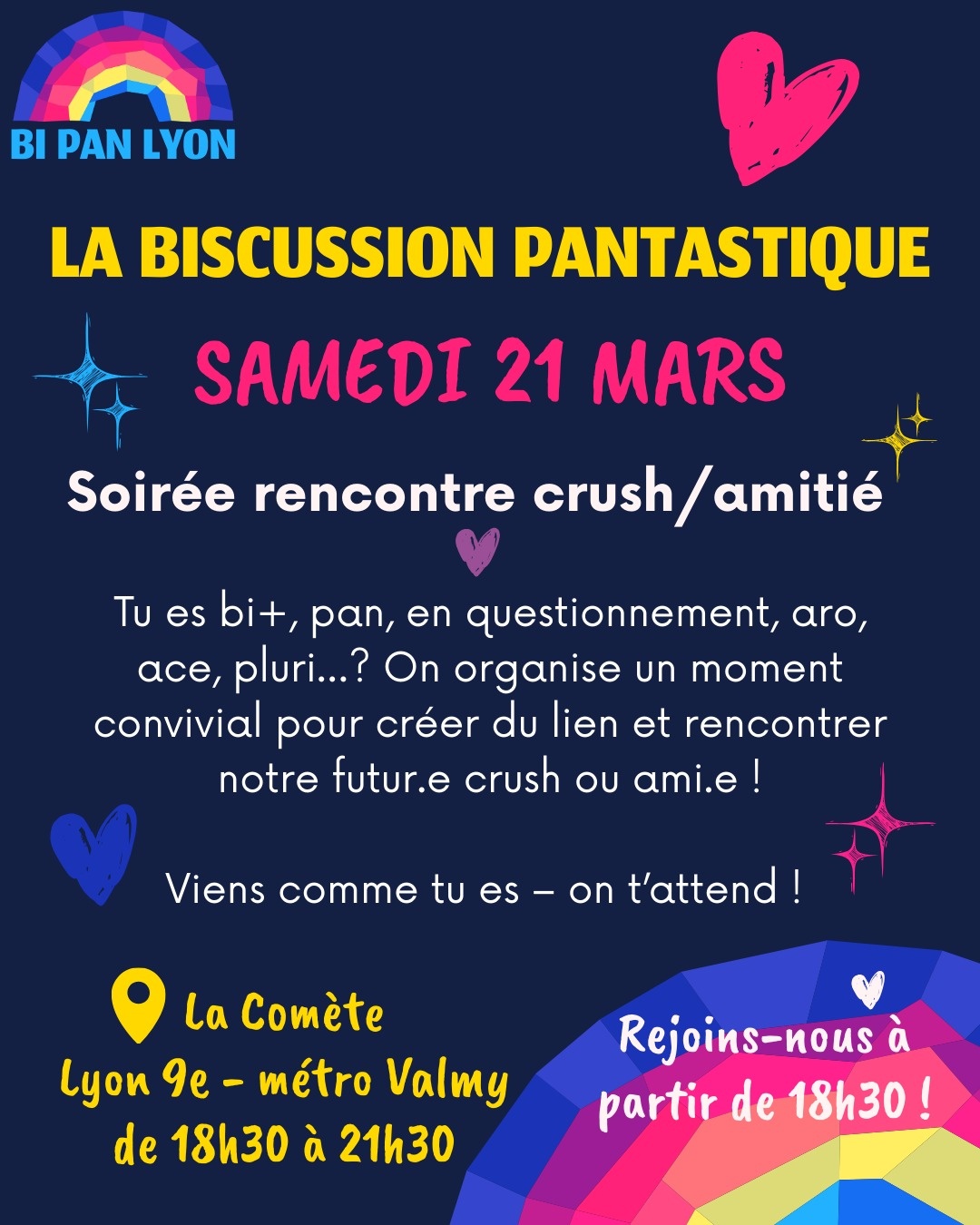 Le Collectif BiPan Lyon organise une soirée de rencontre entre personnes Bi, Pan, en questionnement, ou toute personne concernée par la fluidité des attirances (aro, ace, pluri, omni, etc.), le 21 mars de 18h30 à 21h30.
