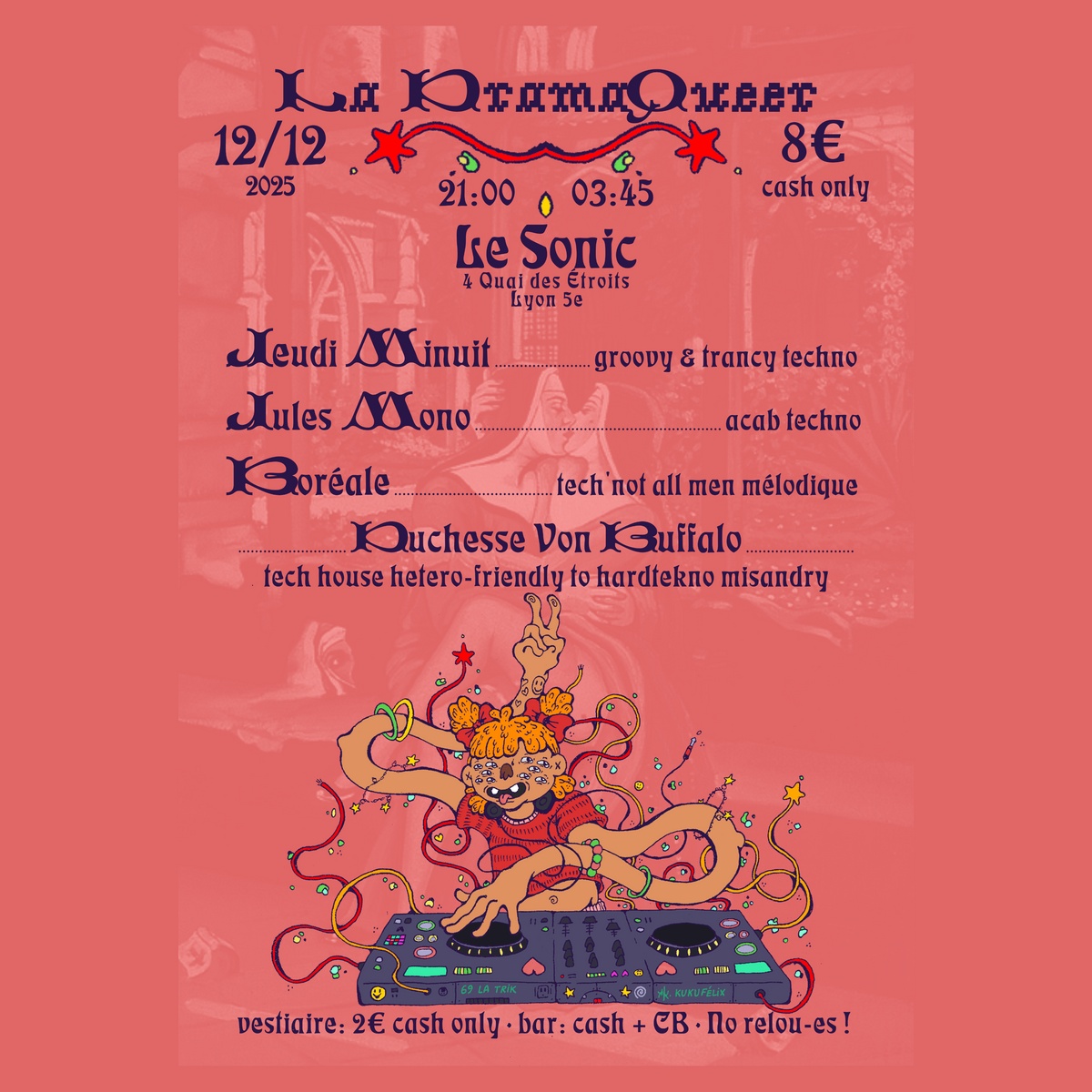 Queer punk dans l’âme, Duchesse Von Buffalo, co-fondatrice de plusieurs crews d’artistes et de technicien·ne·s, est une figure respectée de la scène techno underground lyonnaise. Son univers est un mélange explosif de grosses basses groovy, de synthés diaboliques et de tracks sélectionnées avec un soin maniaque : du son puissant, brut et sans concessions. Prépare ton short ignifugé — la Duchesse ne garantit pas l’absence d’auto-combustion.