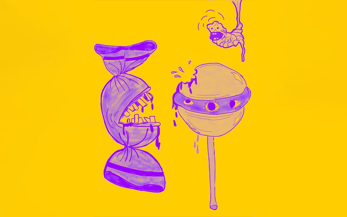 Avec bêtise, acidité et érotisme, décollons nos premiers amours des dessous de table, remâchons nos fantômes, croquons à nouveau dans nos souvenirs d’enfance, refaisons fondre sous nous langues les bonbons de la vie. Les canines en avant.