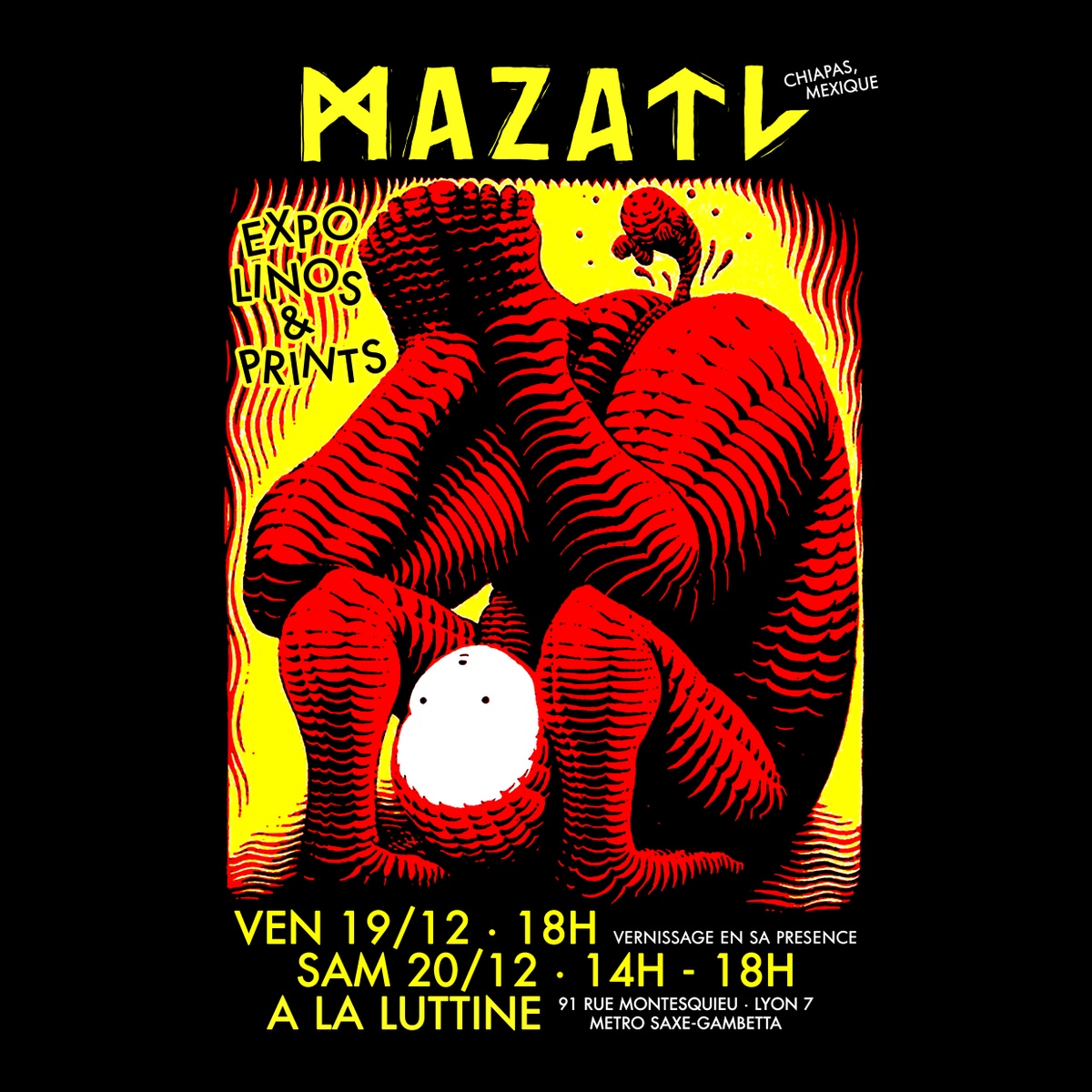L'excellent artiste mexicain Mazatl viendra exposer quelques grands formats et d'autres prints de ses linos magiques le vendredi 19/12 et le samedi 20/12 à La Luttine, 91 rue Montesquieu, Lyon 7 (metro Saxe-Gambetta).