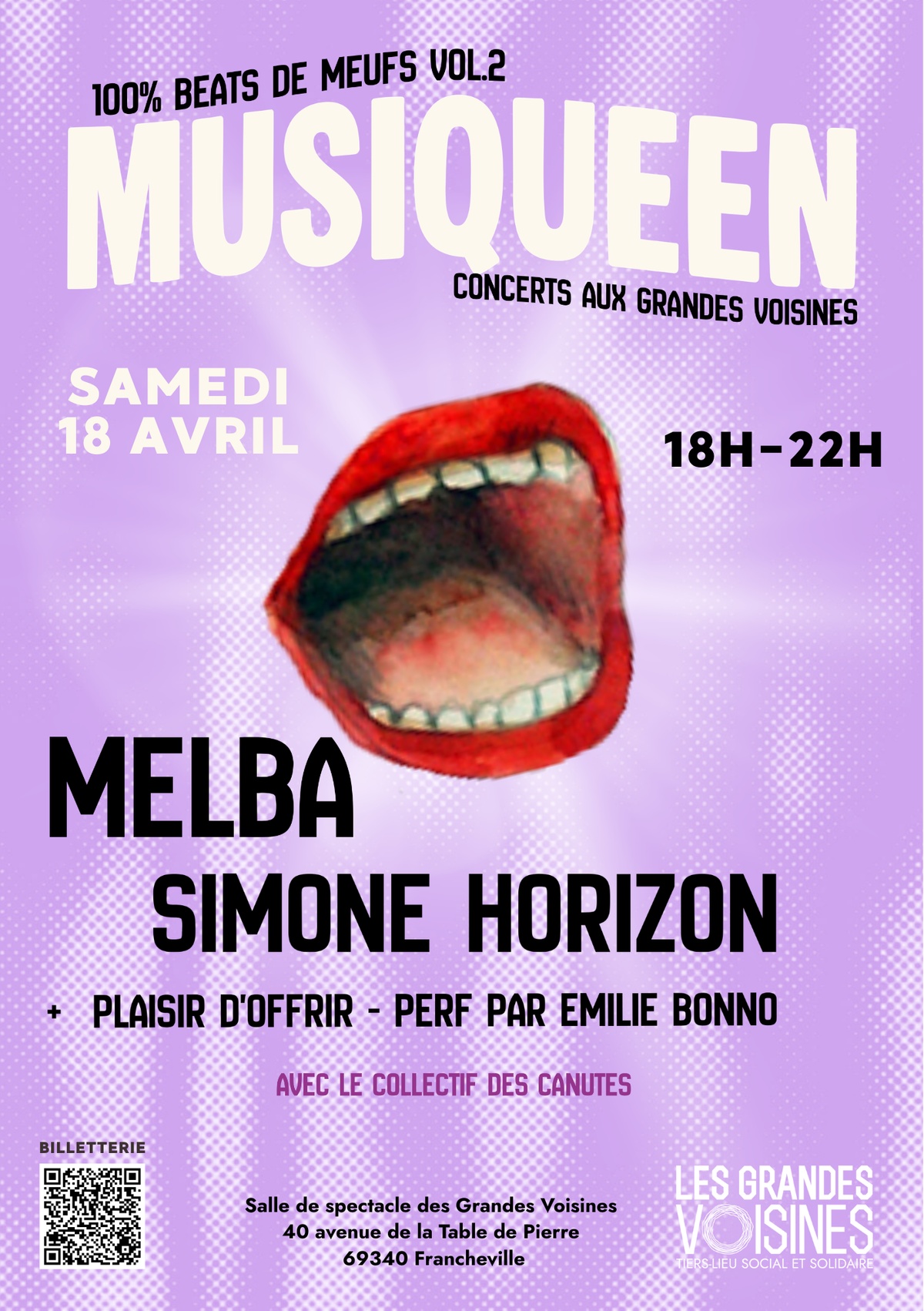 🎶 Concerts 100 % beats de meufs ! 🎶 2ème session dédiée à la musique faite par des meufs avec en plus un spectacle de meuf. Une soirée engagée, vibrante et festive pour montrer que les artist·E·s sont nombreuses, talentueuses et locales ! Au programme : ouverture des portes à 18h avec un stand du collectif des Canutes 19h : Simone Horizon : chanson arty pop chantées en français 20h : Plaisir d'offrir par Emilie Bonno : solo performé 21h30 : Melba en trio : pop solaire ultra groovie