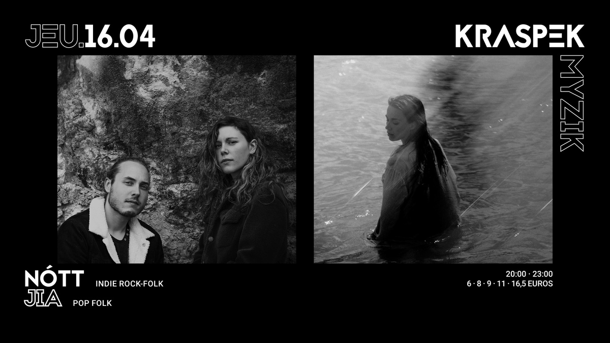𝘽𝙞𝙤 // Nótt – duo indie folk-rock – c'est une chanteuse-guitariste et un batteur claviériste-xylophoniste. Parfois tout est dépouillé, sur un fil, comme pour mieux entendre le silence. Parfois, ça bouillonne à l'intérieur et ça tape fort. Le duo trouve sur scène un endroit où exprimer toute sa vulnérabilité. Pour apprendre à dire et à prendre place. Pour accepter le vide, le bruit, la folie, le vertige, l’erreur, la surprise, la peur. À deux, iels partagent leur complicité, et livrent ce qu'iels ont de plus fragile et de plus intense.