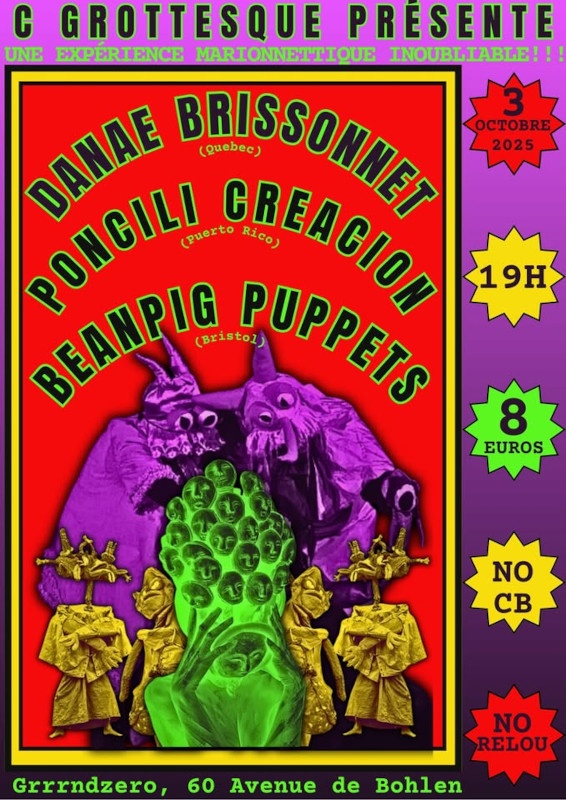 Au Grrrndzero le 3 Octobre 2025, featuring des performances de Beanpig puppets de Bristol, Poncili Creacion de Puerto Rico et Danae Brisonnet du Quebec, tout ça suivi d'un DJ set.